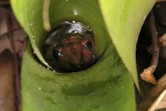 Во-первых, голова не случайно похожа на каску. Это каска и есть. В периоды отдыха животное ищет себе дупло или розетку бромелиевых растений (как на первом фото) наполненные водой.