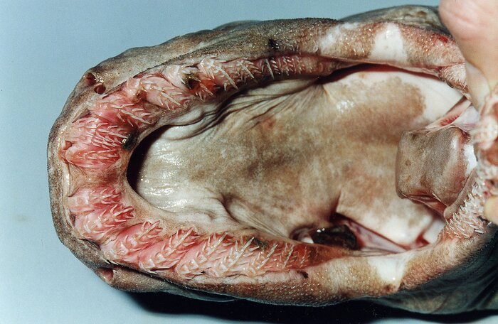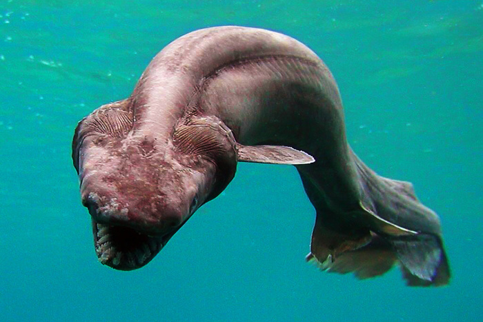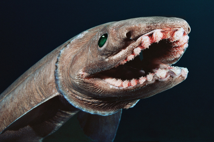 У неё шесть пар жаберных щелей, а не пять, как у большинства акул. Эти жабры доходят до самого низа глотки и придают ей вид не то гофрированной трубы, не то средневекового воротника. Добавьте к этому сотни мелких, загнутых назад зубов, расположенных в двадцати пяти продольных рядах — и получите идеальный инструмент для поедания кальмаров, рыб и прочей глубинной вкуснятины.
