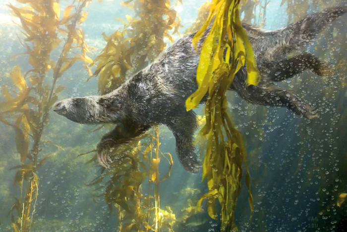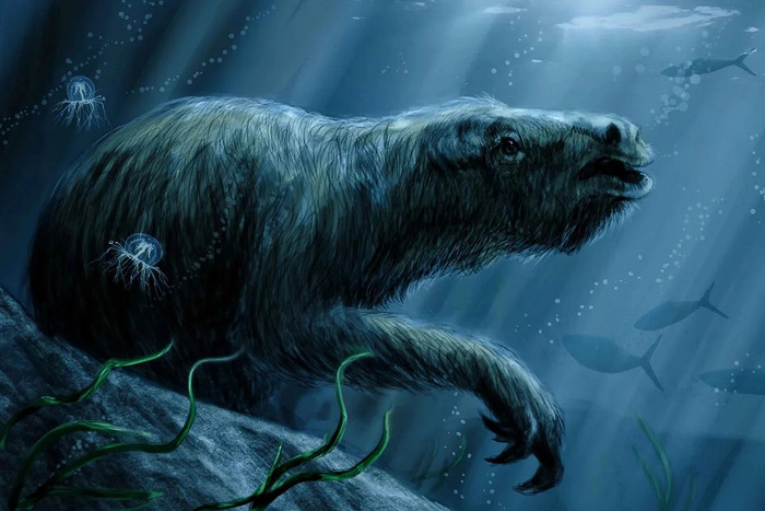 Целых четыре миллиона лет понадобилось ему, чтобы уйти на глубину. Постепенно кости его тяжелели, чтобы было удобнее нырять, ноздри переместились на верх морды, сама морда удлинилась и опустилась, чтобы удобнее было срывать донную растительность, а длинные крюкообразные когти помогали животному удерживаться за камни, борясь с течениями и прибоем.