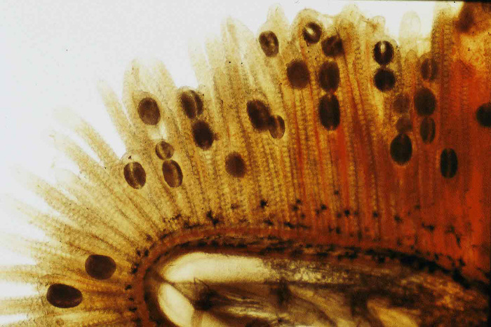 Когда наступает время, во тьме её раковины образуются личинки, называемые глохидиями. Это такие маленькие двустворчатые детки с немаленькими шипами на концах обеих створок. В момент, когда мимо моллюска проплывает рыба, он выстреливает в неё глохидиями, которые "вгрызаются" в будущего хозяина.