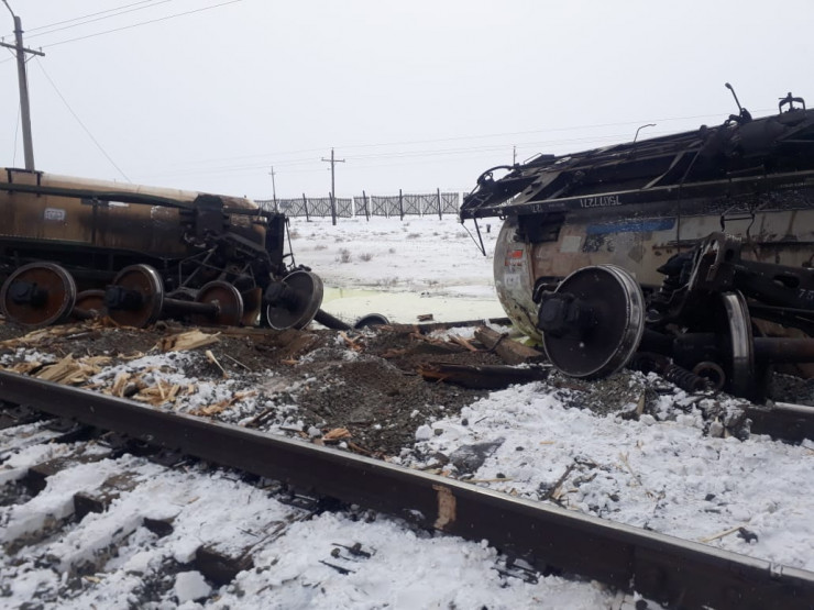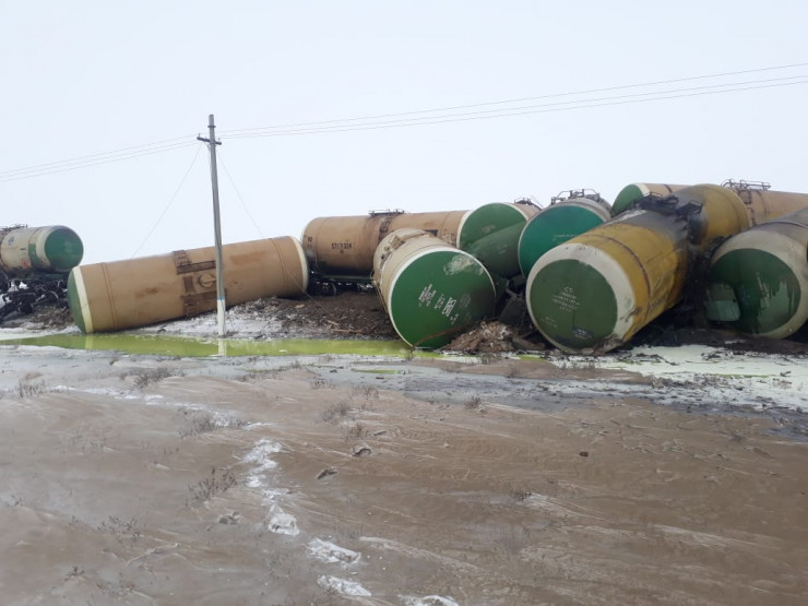 Сход цистерн и вагонов произошел 26 февраля в 11.55 на железнодорожной станции Улпан Шалкарского района. Официальный представитель МЧС Талгат Уали сообщил, что произошел сход 22 грузовых цистерн из 43 вагонов с последующем опрокидыванием 13 цистерн и повреждением железнодорожного полотна протяженностью 150 метров. Жертв и пострадавших нет.