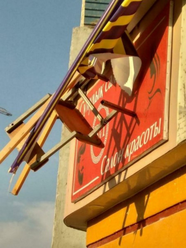 Выброшенный из окна квартиры железный стул сломал вывеску парикмахерской в Актау. Личность нарушителя устанавливают, передает Tengrinews.kz со ссылкой на Lada.kz.