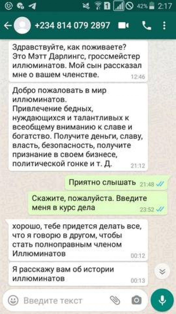 С Михаилом связался некий Мэтт Дарлингс, который, по его словам, является полноправным членом клуба иллюминатов. Он якобы помогает заинтересованным людям стать богатыми и известными.
