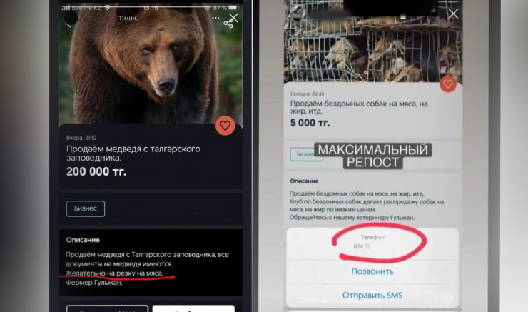 Объявление о продаже бездомных собак и медведя из Талгарского заповедника на мясо распространяется в социальных сетях. В Департаменте полиции Алматы прокомментировали ситуацию, передает корреспондент Tengrinews.kz.
