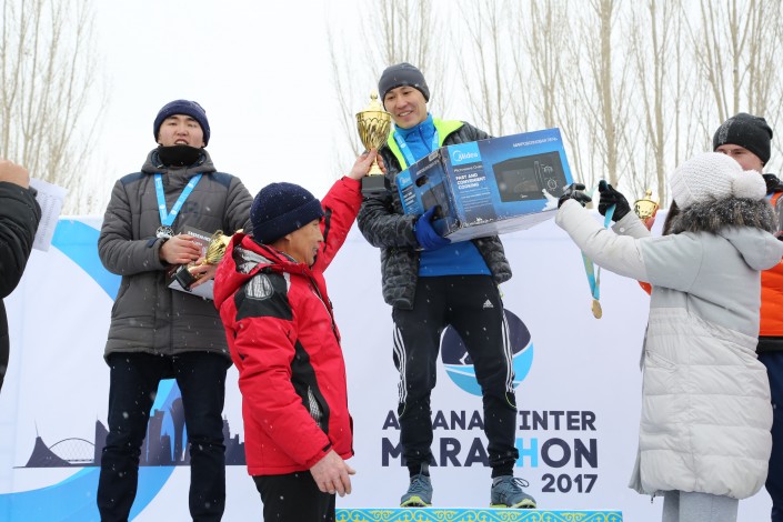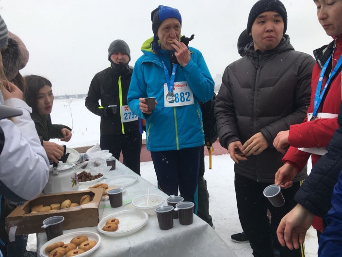 С самого утра в Астане установилась теплая и очень снежная погода, а в триатлон-парке первые спортсмены начали разминку еще затемно. В соревнованиях на три дистанции приняли участие около 400 человек. Чуть больше 20 из них сумели преодолеть дистанцию в 42,2 километра под непрекращающимся снегопадом.