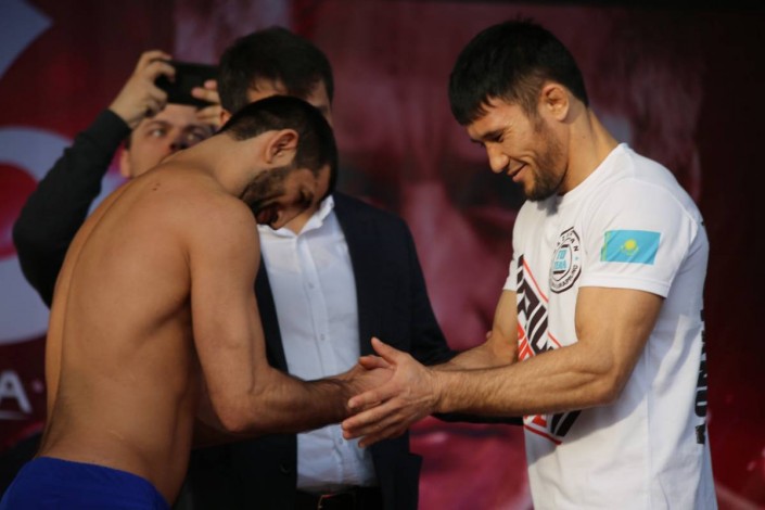В субботу бойцы провели дуэль взглядов. Мероприятие прошло в дружелюбной обстановке и вызвало овации зрителей, сообщает спортивный портал Vesti.kz