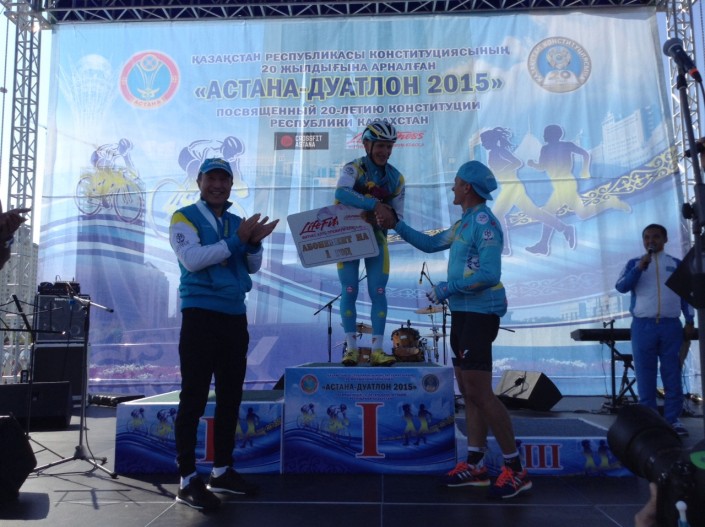Главный приз - годовой абонемент в престижный фитнес-клуб - присужден абсолютным чемпионам "Астана-дуатлон-2015" Амилии Искаковой (48,32 минуты) - 1995 года рождения, и Юрию Щербинину (40,10 минут) - 1996 года рождения, среди участников от 36 до 50 лет лучший результат показал Жанболат Кадыров, среди женщин в этой же возрастной категории победительницей стала Татьяна Михалева, а среди участников старше 51 года победителем стал Леонид Лечщинский, они преодолели оба этапа соревнования быстрее всех.