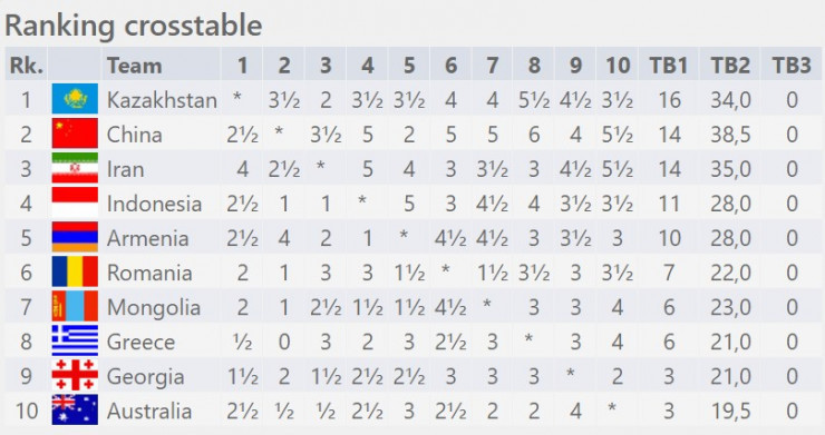 После шести туров Казахстан, который сотворил сенсацию в матче с Китаем, а Жансая Абдумалик взяла верх над четырехкратной чемпионкой мира Хоу Ифань, лидировал в группе. Затем казахстанские шахматисты обыграли Австралию со счетом 3,5-2,5.