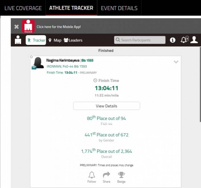 Керимбаева среди участниц возрастной категории 40-44 года пересекла финиш на 80-й позиции. Преодоление всех трех этапов она произвела за 13 часов 4 минуты 11 секунд.