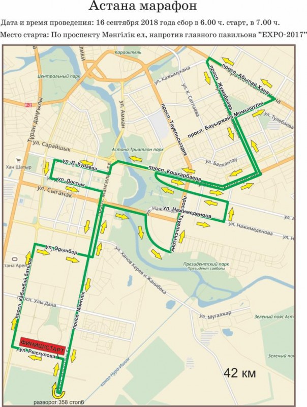 Масштабный забег стартует возле территории EXPO и затронет проспект Кабанбай батыра, улицу Орынбор, проспекты Тауелсиздик, Кошкарбаева, Жумабаева, Абылай хана, Бауыржана Момышулы и Мангилик Ел.