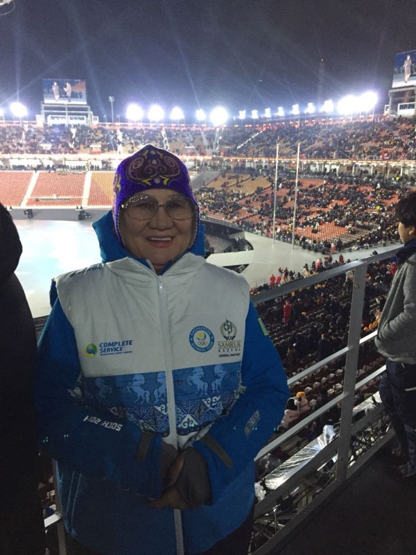 Это Карлыгаш-апа. Приехала поболеть за нашу сборную. Особенно за конькобежцев и фигуристов.