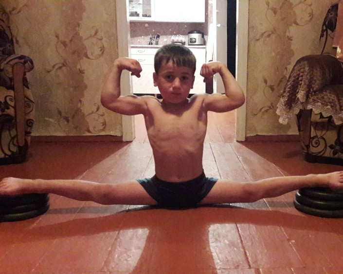 Рахим живет в обычной семье в селе Дуба-Юрт (Шалинский район). Он занимается со своим отцом Шаруди. У мальчика отличная растяжка, он держит планку на руках. Но все же любимое упражнение юного атлета - это как раз отжимание.