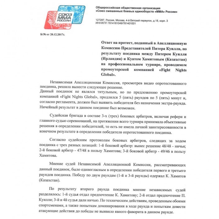 "Независимая апелляционая комиссия Союза ММА России изменила результат боя между Куатом Хамитовым и Питером Куилли. Напомним, по итогам пятираундового рейтингового боя, состоявшегося 26 ноября в Алматы, судейская бригада признала победителем противостояния бойца из Казахстана. По итогам рассмотрения протеста, поданного командой Куилли, независимая комиссия изменила исход боя на ничейный результат", - говорится в сообщении, опубликованном на странице промоушена в Instagram.