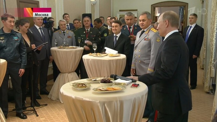 Теперь самое запоминающееся, все, кто мало-мальски знаком с протоколом, понимает, что речь о фото и тем более о "селфи" планируется заранее. И после официальной части меня внезапно "просит" можно так выразиться один из делегированных генералов сфотографировать его на телефон с министром обороны РФ Сергей Кужугетовичем Шойгу, мне только лишь получилось неловко пожать плечами и сделать несколько фотографий. Но соль в том, что в момент импровизированной фотосессии президент РФ Владимир Путин вышел лично поприветствовать каждого делегированного генерала и, как показалось моим знакомым, начать запланировал с меня, НО ... я был занят памятным фотографированием. Но внимая наставлениям дорожайшей супруги: "Без фото с Путиным домой не возвращайся", начал строить планы на будущее и таки смог найти момент и обратиться к президенту: "Владимир Владимирович! Вам привет от супруги Ольги!", пожав мою руку с улыбкой, президент РФ Владимир Путин ответил: "Спасибо, ей тоже".
