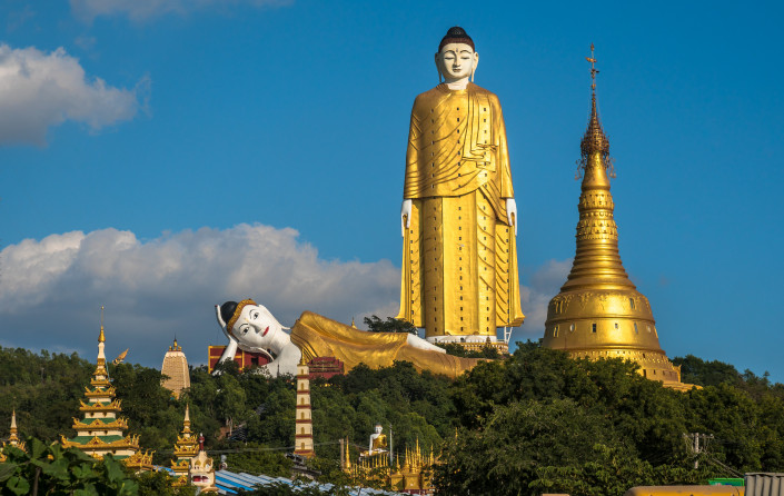 Лечжун-Сасачжа - статуя Будды, Кхатакан-Таунг, Мьянма. Общая высота статуи вместе с постаментом - 129,24 метра. Она посвящена Будд и представляет собой изображение Шакьямуни - духовного учителя, которого и считают основателем буддизма. Недалеко от нее расположилась еще одна статуя - лежачего Будды. Интересным фактом является то, что лежачий Будда появился здесь на 17 лет раньше стоящего Будды.