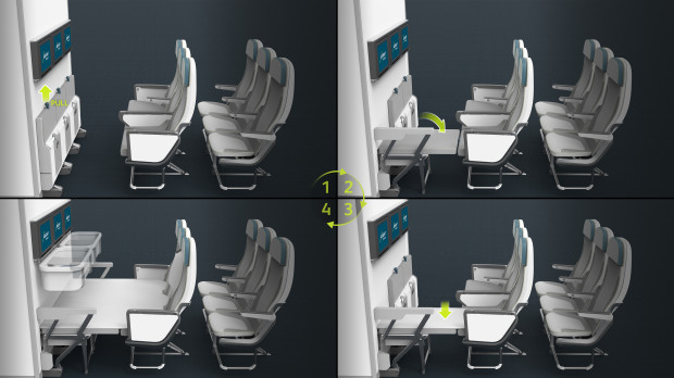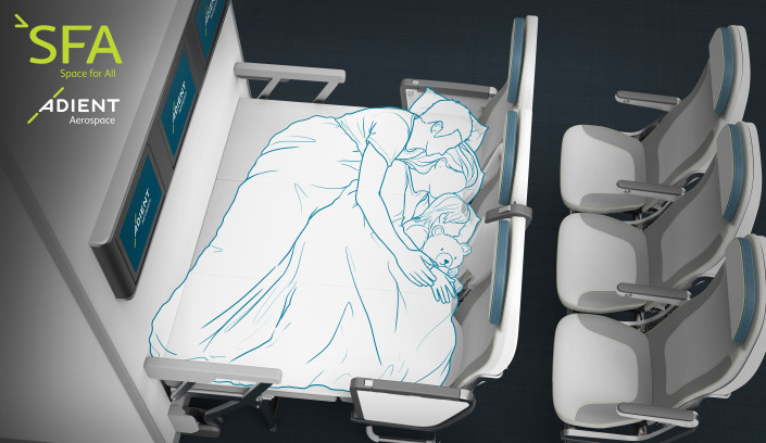 1. Так, Adient Aerospace предлагает использовать места, расположенные у перегородок между бизнес-классом и экономом, как спальную зону. По сути, удлинитель сиденья, прикрепленный к перегородке, раскладывается и создает плоскую поверхность.