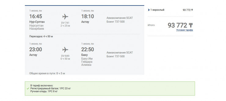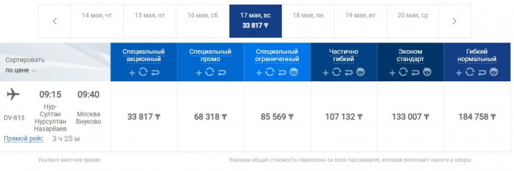 В мае, как обозначено на сайте авиакомпании, открываются рейсы из Нур-Султана в Москву. Каждое воскресенье месяца полететь в столицу России можно по цене от 33 817 тенге до 184 758 тенге, в зависимости от выбранного тарифа и даты покупки билета.