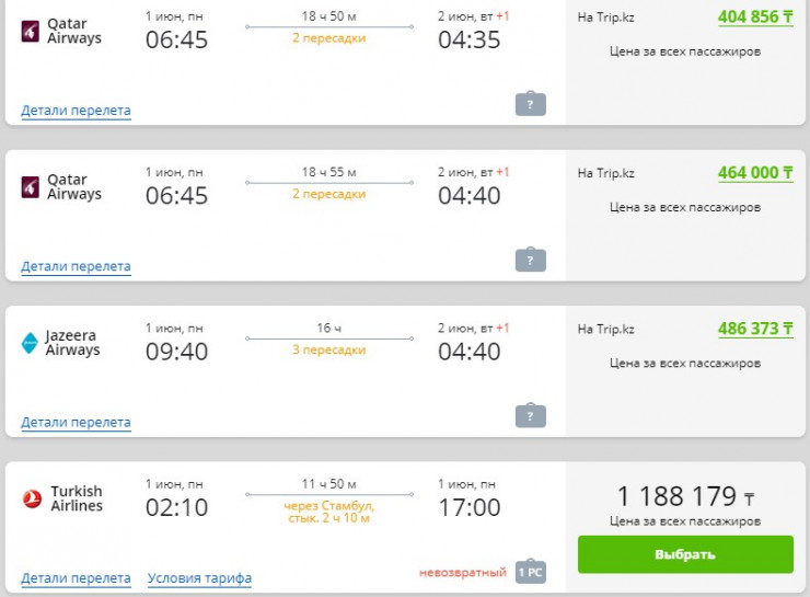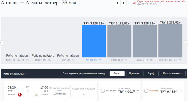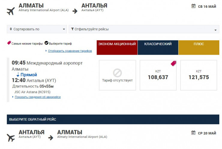 "Эйр Астана" предлагает прямые перелеты из Алматы в Анталью с 16 мая 2020 года. Стоимость билета варьируется от 108 637 тенге до 121 575 тенге в зависимости от выбранного тарифа. Обратно отображаются как прямые рейсы в Алматы, так и с пересадкой в Нур-Султане.