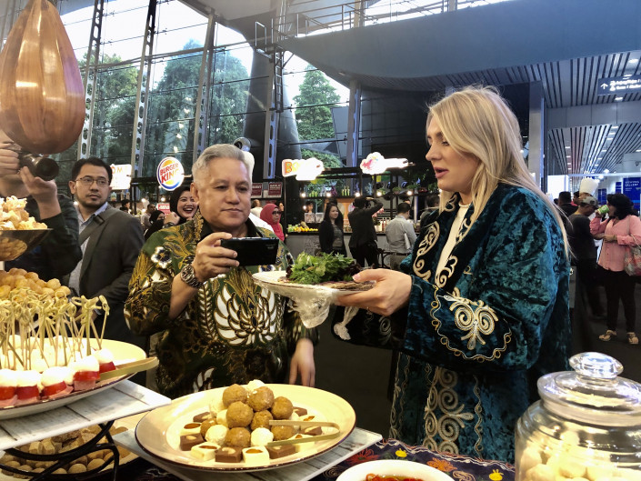 Казахскую кухню на фестивале MIGF KULinary (Malaysia International Gastronomy Festival) представила известная сеть ресторанов Parmigiano Group, которая при поддержке авиакомпании "Эйр Астана" привезла из Казахстана основные деликатесы нашей кухни: курт, жент, халву, ежегей, шубат, кумыс, казы, баурсаки… вместе с оборудованием и прочей кухонной утварью это более 600 килограммов!
