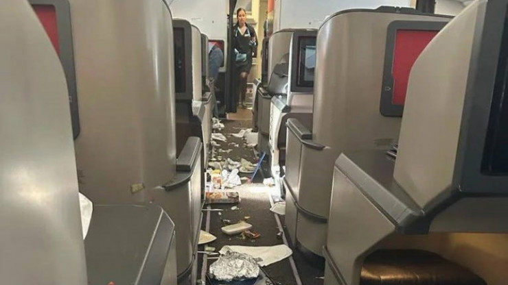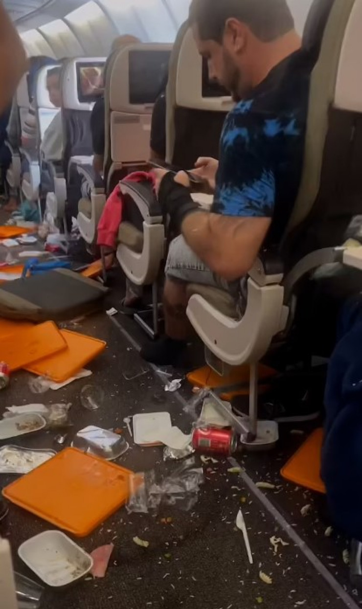 "Пассажирка поделилась с подписчиками кадрами, как в результате тряски ее вино разлилось по потолку и полу салона, а проходы оказались завалены едой, подносами и пластмассовыми приборами.