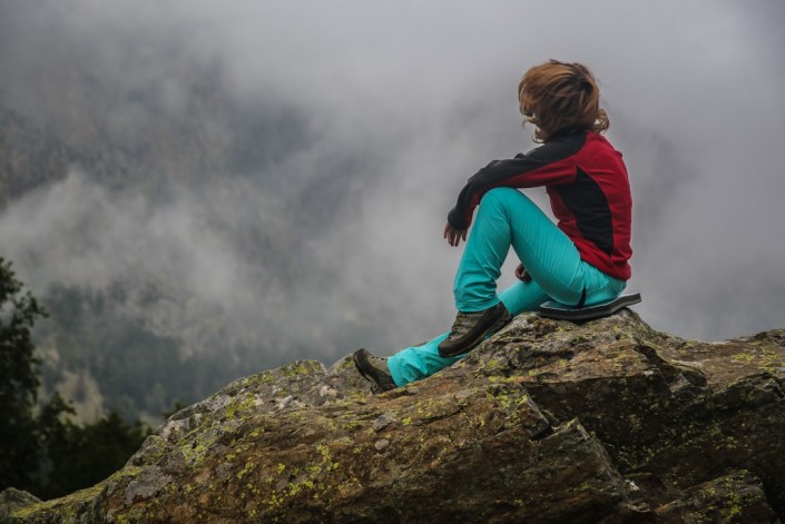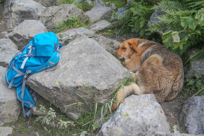 А пока наш рыжий друг, не теряя времени даром, развалился между камней. Но стоило нам зашевелиться, собираясь в обратный путь, как он бодро вскочил на ноги, виляя хвостом. Но уходить не хотелось. Сложно сказать, что именно привело нас тогда в такое меланхолическое состояние: то ли хрустальная тишина природы, то ли осознание того, что отпуск подходит к концу и необходимо возвращаться в пыльный город. И, словно вторя нашему настроению, на вершине горы показалась снежная тучка. В свои права вступала осень.