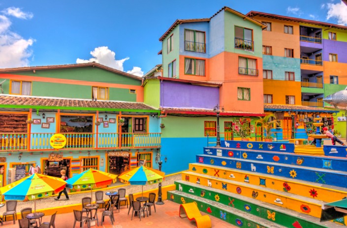 Самый яркий в мире город - Гуатапе, Колумбия. В Колумбии, недалеко от второго по значимости города страны Медельина, расположился небольшой разноцветный городок Гуатапе. В нем все дома и здания, в том числе магазины, кафе, школы, даже больницы и муниципалитет, раскрашены и разрисованы в яркие цвета. Кроме того, нижние части фасадов многих домов дополнены оригинальными рисунками со сценами из жизни города. Разрисовывать свои дома таким образом местные жители начали более 150 лет тому назад, поэтому сегодня можно легко изучить историю города по этим рисункам.