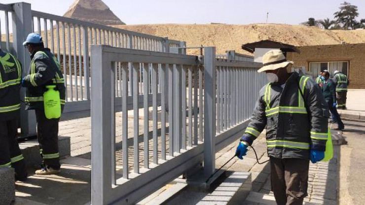В комплекс пирамид входит пирамида Хеопса, являющаяся единственным из семи чудес света сооружением, сохранившимся в наше время. Санитарная обработка проводится под руководством министерства по делам древностей Египта. Рабочие в униформе распылили специальные препараты, дезинфицировали перила и деревянные дорожки, кассы и туристический центр при входе, пункт пропуска посетителей, рентгеновские аппараты и другие помещения. Материалы для очистки были утверждены министерством здравоохранения и народонаселения Египта.