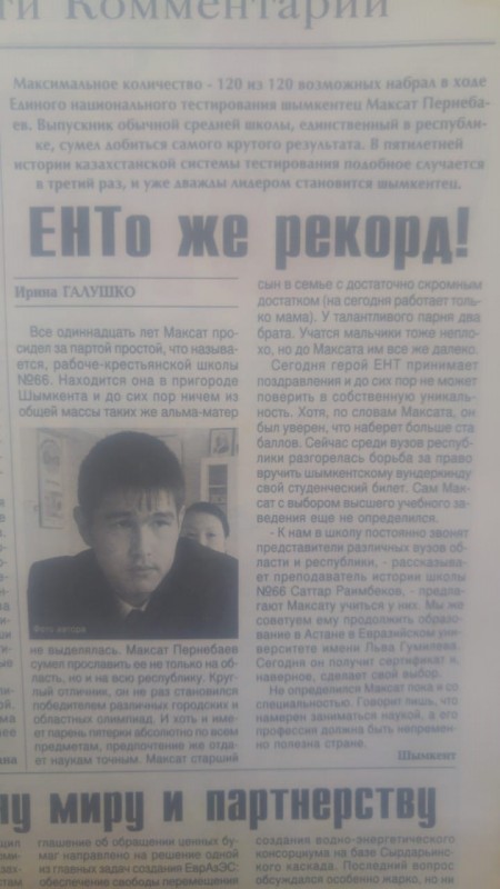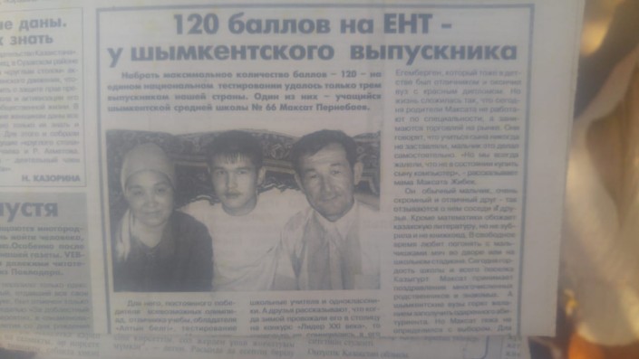 Максат Пернебаев после тестирования проснулся знаменитостью. Журналы, газеты и телеканалы наперебой записывали интервью с выпускником. Вырезки из газет со статьей о Максате бережно хранит его мама.