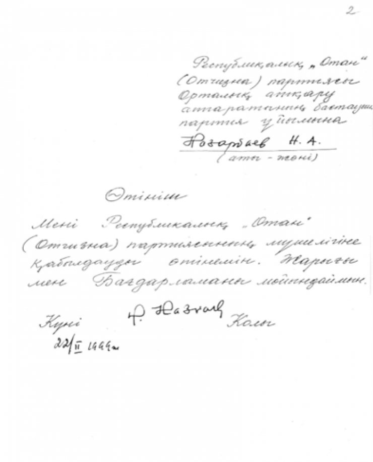Копия заявления о приеме в партию Назарбаева, 1999 год