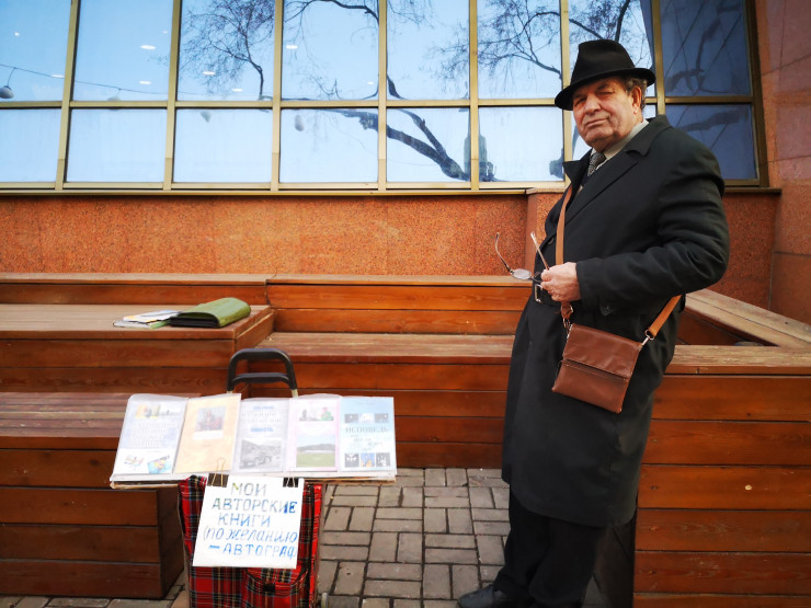 Выглядит он очень импозантно: шляпа, рубашка, галстук, плащ. Он продает книги. Свои книги. Тем, кто покупает, он оставляет на память пожелания с автографом.