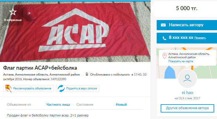 Кстати, история партии "Асар", по всей видимости, представляет какую-то ценность для коллекционеров. Так, на сайте объявлений можно найти любопытные предложения. Значок партии "Асар" там продают за 1000 тенге, а флаг и бейсболку - за 5000.