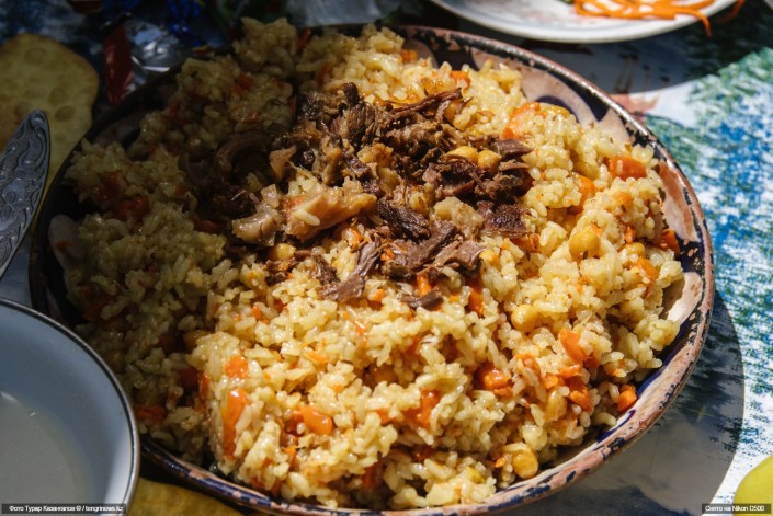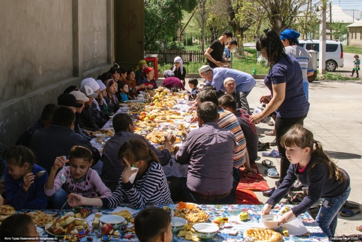 В тот же день мы увидели длинные накрытые столы с едой, расставленные вдоль улицы - местные все еще праздновали Наурыз. Так здесь положено: сначала одна улица накрывает дастархан, на следующей неделе - другая. Завидев нас, журналистов из столицы, местные жители тут же усадили нас за стол и накормили ароматным рассыпчатым пловом.