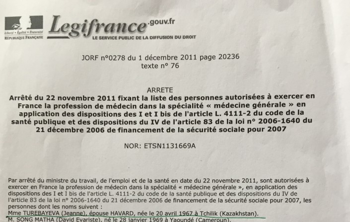 На нижнем фото - местное издание "Закон Франции". Благодаря отличной защите докторской диссертации и высшему баллу, Туребаева стоит первой в списке иностранных докторов, которым разрешили практиковать и работать с больными во Франции.