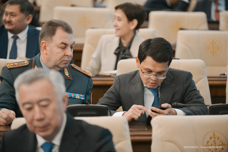 Министр цифрового развития, инноваций и аэрокосмической промышленности Багдат Мусин что-то демонстрирует на своем смартфоне министру по чрезвычайным ситуациям Юрию Ильину, хотя до начала сессии все участники должны были оставить свои телефоны в специальных ячейках.