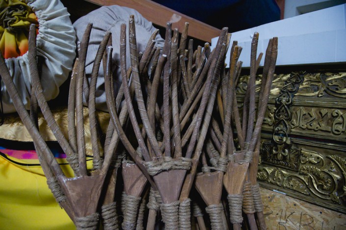 Своими секретами мастерства пользуются и бутафоры театра. Их главная задача - обеспечить артистам комфортное использование реквизита при исполнении. Например, 25 вил и грабель для крестьян они изготавливают в облегченном варианте, но в то же время следят, чтобы инструменты получились прочными. Самая кропотливая работа была проделана над орденами и медалями. Предметы хотя и мелкие, но сделали их очень реалистичными. И здесь в ход шла практически ювелирная работа, в которую входила не только резка металла для придания специальной витиеватой формы ордена, но и инкрустация его искусственными камнями. Если присмотреться, то посередине можно увидеть даже лакированный рисунок.