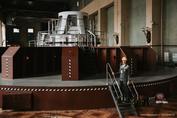 Оцените внушительные размеры одного гидроагрегата в сравнении с ростом специалиста по связям с общественностью Усть-Каменогорской ГЭС Светланы Нищенко. Напоминаем, это лишь верхушка сложного механизма.