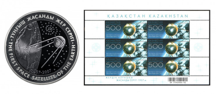 Монета и блок почтовых марок, выпущенные в Казахстане к юбилею запуска первого искусственного спутника Земли.