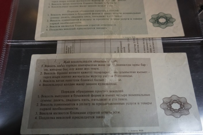 "Вот и доказательство отсутствия наличных денег - такие векселя принимали в оплату коммунальных услуг и некоторых видов товаров. Этот вексель печатался в Казахстане, на типографии Центробанка", - рассказывает нам коллекционер.
