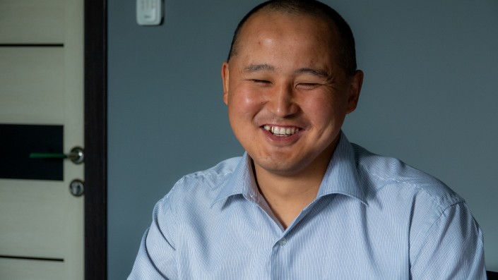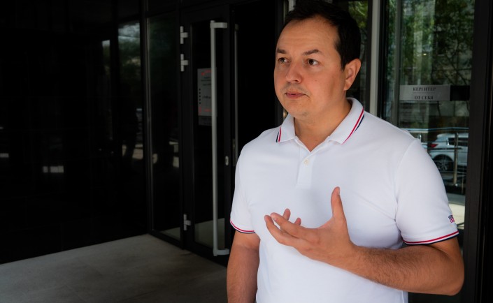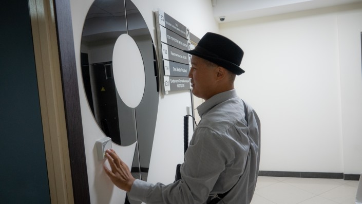 Кенжегул Сейтжан, он видит только силуэты, передвигается с помощью палочки, на интервью он приехал на социальном такси. Предприниматель, в 2017 году он открыл по франшизе хостел, который принимает ежемесячно 1500 человек.