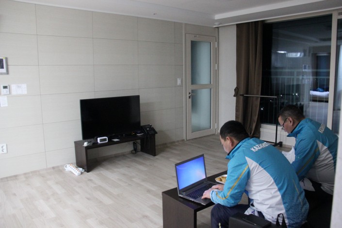 А вот фристайлистка Жанбота Алдабергенова не удержалась и захватила с собой курт. Вот так выглядит стандартная комната в олимпийской деревне.