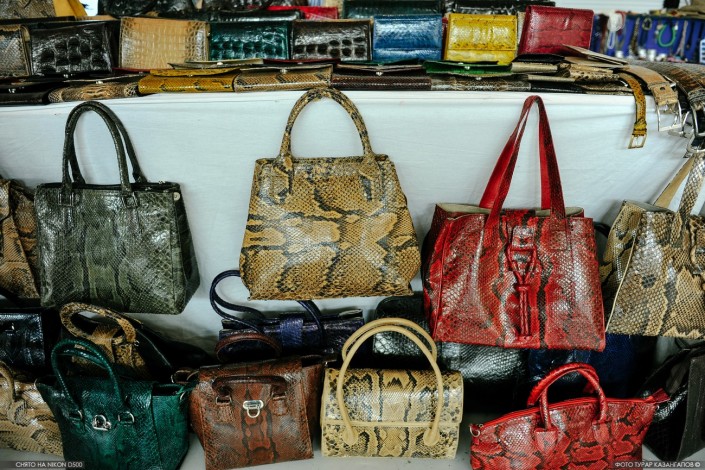 "Цены разные. Змеиная кожа - кобра, питон - десять тысяч тенге, это скидочная цена. Есть крокодил, он дороже - 20 тысяч", - рассказывают покупателям казахстанки, показывая кошельки, ремни и прочие товары.