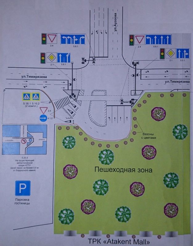 Сейчас пространство перед центральным входом в "Атакент" является пешеходной зоной - здесь поставили вазоны с цветами. Для разворота машин и общественного транспорта на Тимирязева - Ауэзова оставили небольшую площадь. Теперь заехать на территорию Центра делового сотрудничества можно с Тимирязева, западнее улицы Манаса, и со стороны Жарокова - Утепова.