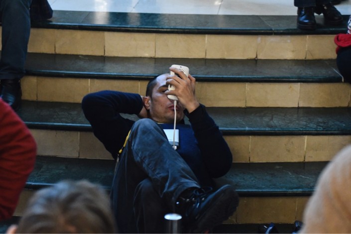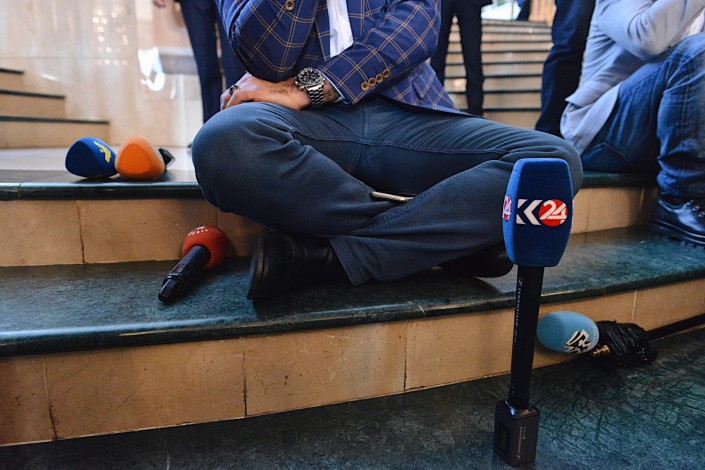 Через какое-то время журнилисты уже сидели на полу, а через какое-то время некоторые из них даже лежали.