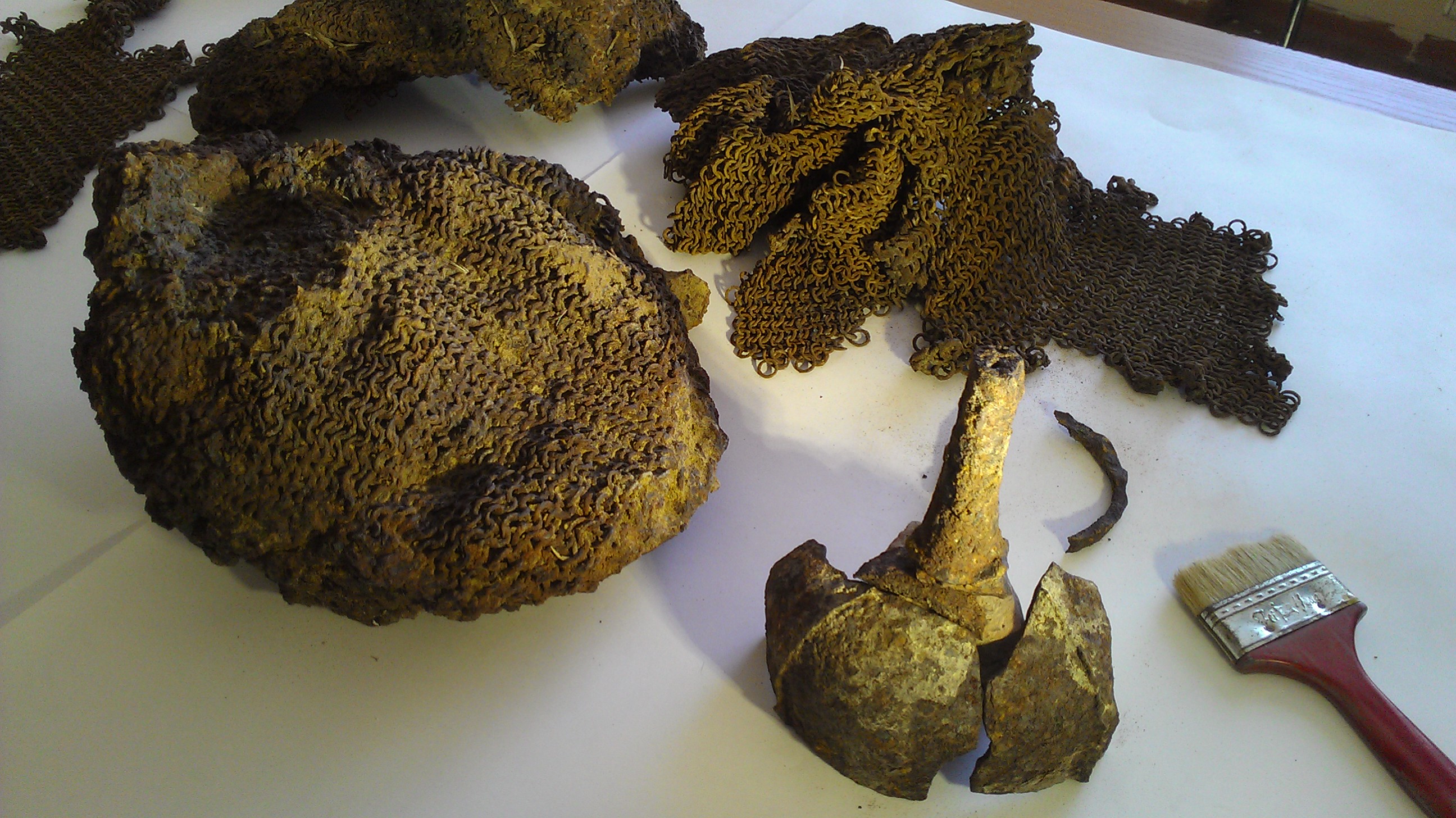 Здесь две кольчуги, накидки под шлем и куски самого шлема