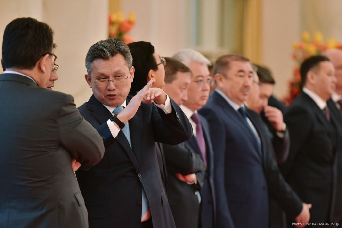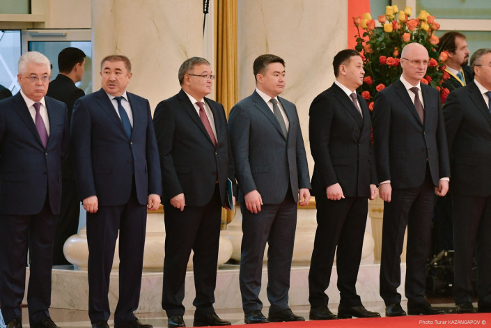 Это казахстанские министры. Обычно они стоят здесь, дожидаясь начала церемонии. Так было и на этот раз. В какой-то момент министры выстроились в линейку.