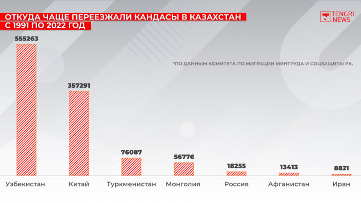 С 1991 года на историческую родину в Казахстан вернулись 1 103 511 этнических казахов. Такие данные озвучили в Министерстве труда и социальной защиты РК. Кандасы чаще переселяются в такие регионы, как Алматинская, Мангистауская, Туркестанская и Жамбылская области. Редакция Tengrinews.kz предлагает узнать, откуда чаще прибывают кандасы и какая помощь оказывается им в Казахстане.