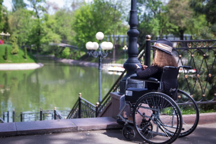 По пути к парковому озеру Катя большая ловко управляется с 18-килограммовым инвалидным креслом, оно все в ярких наклейках, дочка постаралась. Катя маленькая крутит колеса медленно. Они молчат.