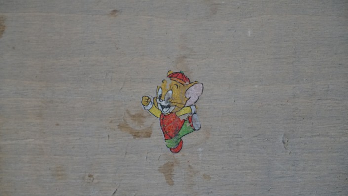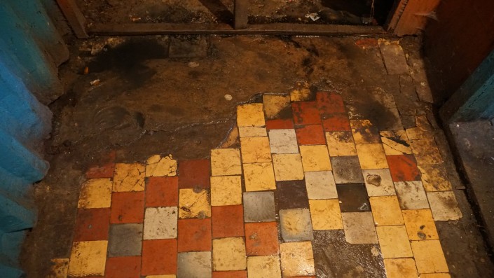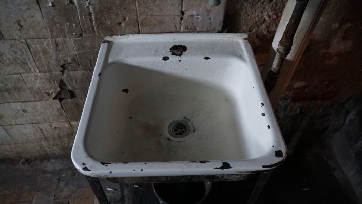 На фоне комнаты с потеками, облупившимися стеной, потолком и полом, цвет этого умывальника создает чрезвычайно угнетающую атмосферу.