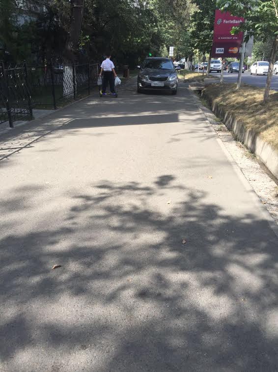 А здесь очевидец сфотографировал автомобиль, припаркованный на тротуаре рядом с городским акиматом. "Парковка на диагональном тротуаре на площади Республики, ведущем от перекрестка улиц Сатпаева и Желтоксан к акимату Алматы. 23.08.2016 в 9.43", - сообщил читатель.