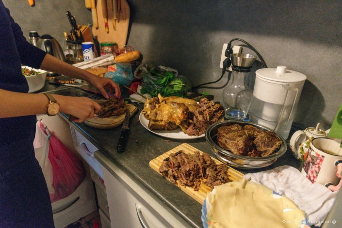 На кухне вовсю идут приготовления. На обед будет бешбармак.